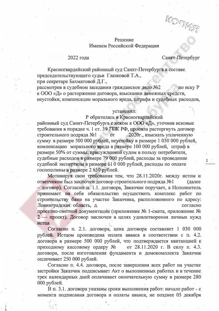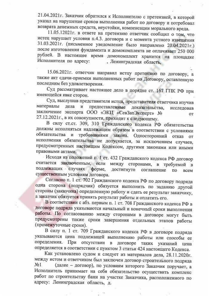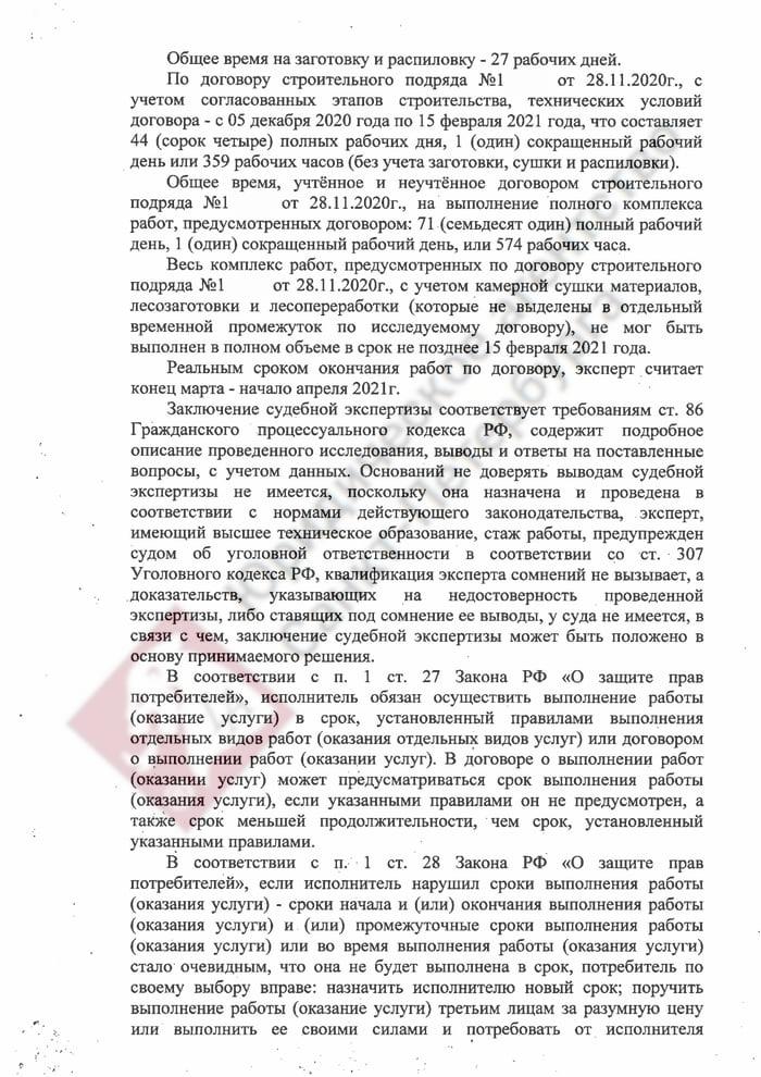 Главный вопрос в суде: когда должен был быть сдан объект. Чтобы снять противоречие из-за опечатки, мы инициировали строительно-техническую экспертизу. Заключение эксперта подтвердило: по строительным нормативам баня должна была быть готова в марте – начале апреля 2021 года. То есть подрядчик уже допустил просрочку, прежде чем выставил счет на доплату. Мы выстроили защиту на документах и экспертизе, а не на устных договоренностях. Суд принял нашу позицию: аргументы подрядчика о «несогласованном сроке» были отклонены, а нарушение сроков признано необоснованным. По Закону о защите прав потребителей наш клиент получил возможность выбрать любой из вариантов: