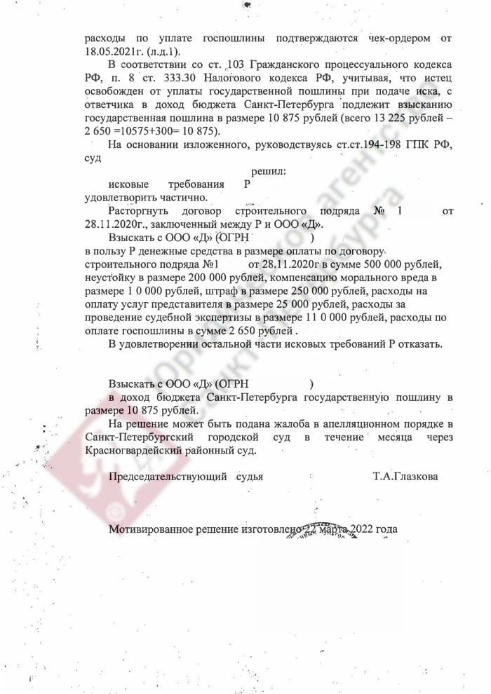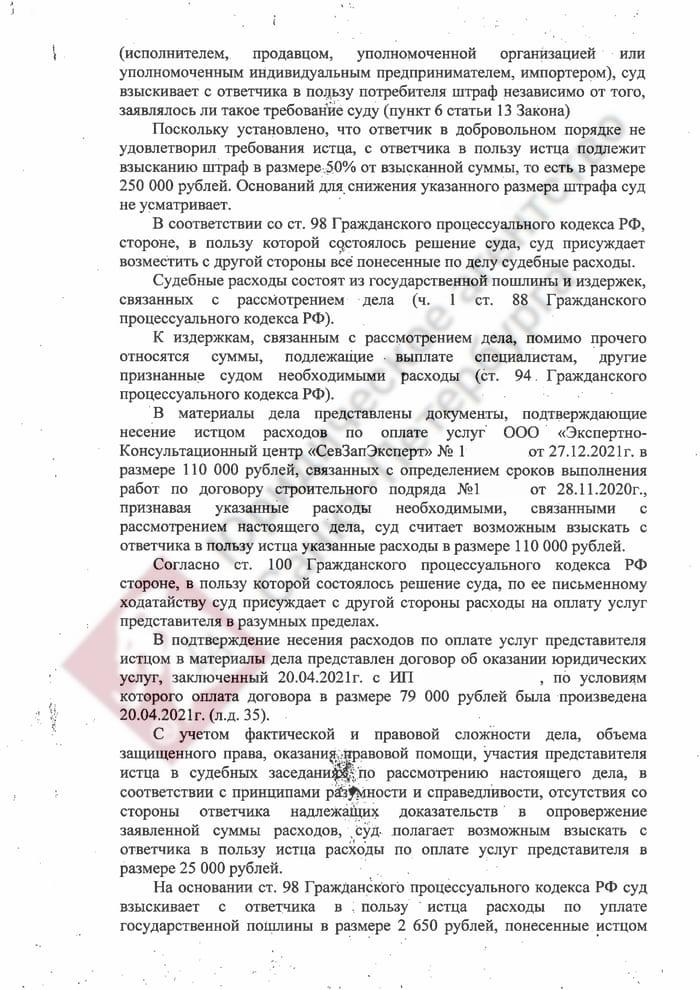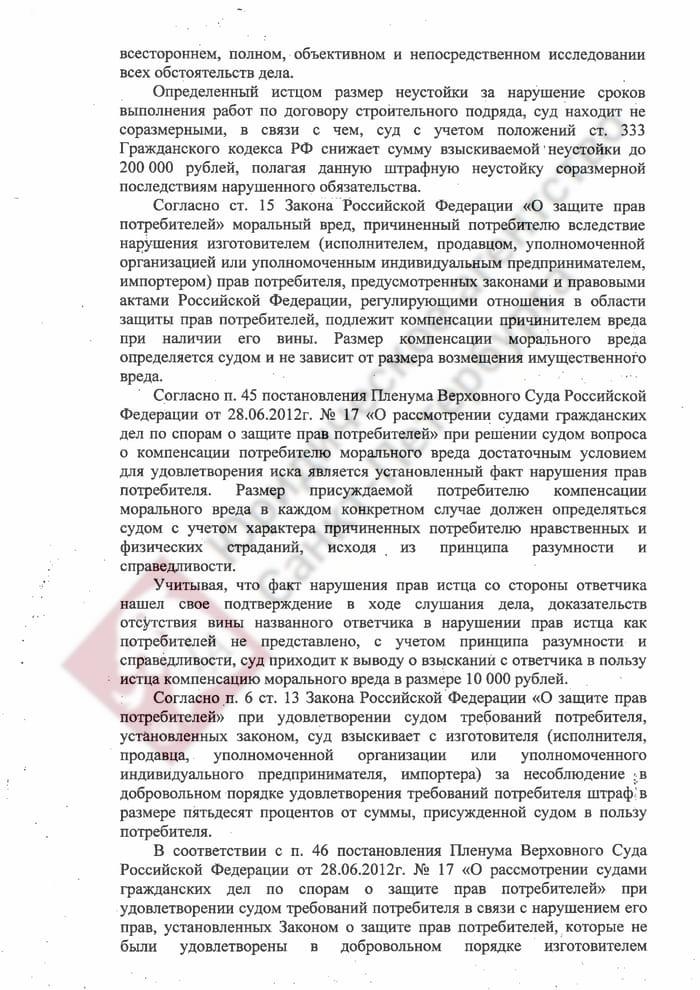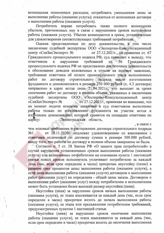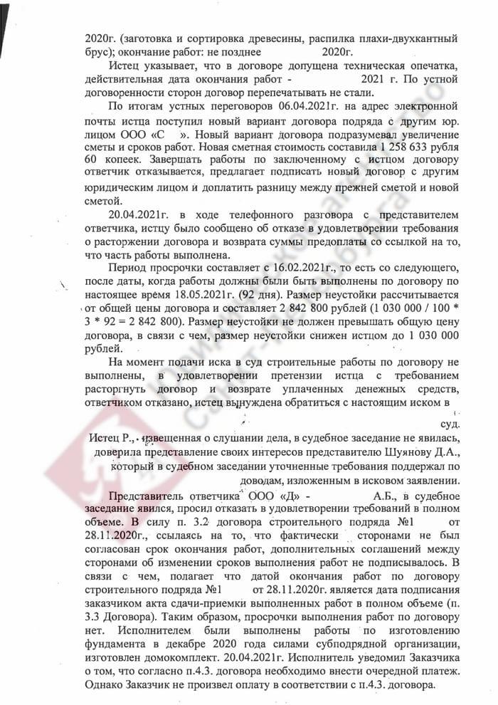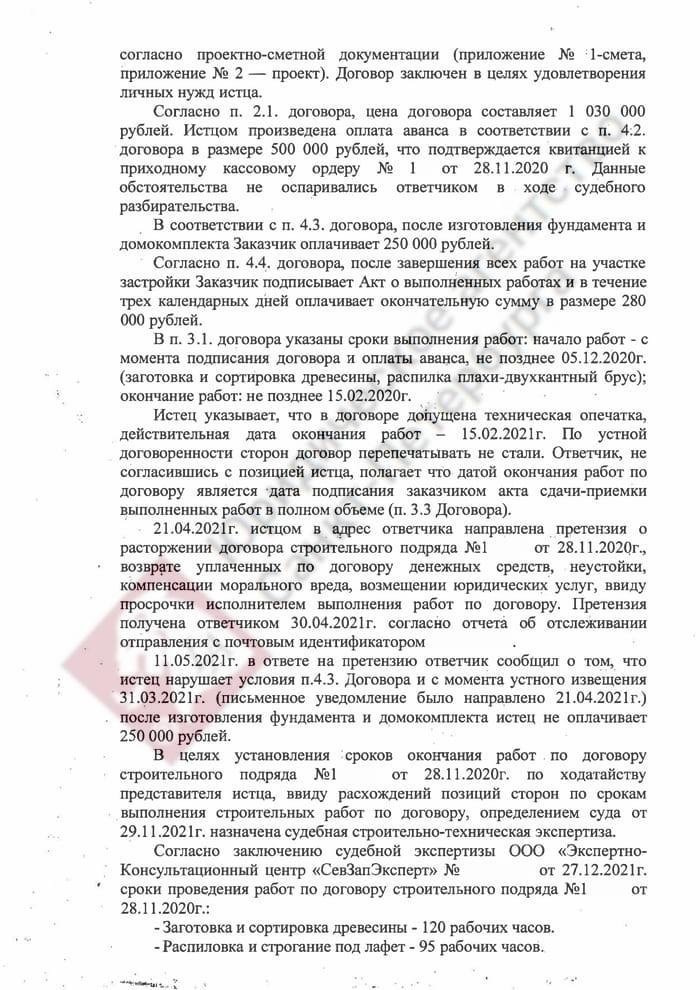 Мы сразу квалифицировали дело как нарушение прав потребителя, так как в договоре указывается, что целью строительства выступает удовлетворение личных нужд заказчика. Истец обратился в суд с требованием расторгнуть договор подряда (где он выступал заказчиком), а также взыскать неустойку, штраф 50% от присужденной суммы и компенсацию морального вреда. Аргументы ответчика заключались в следующем:
