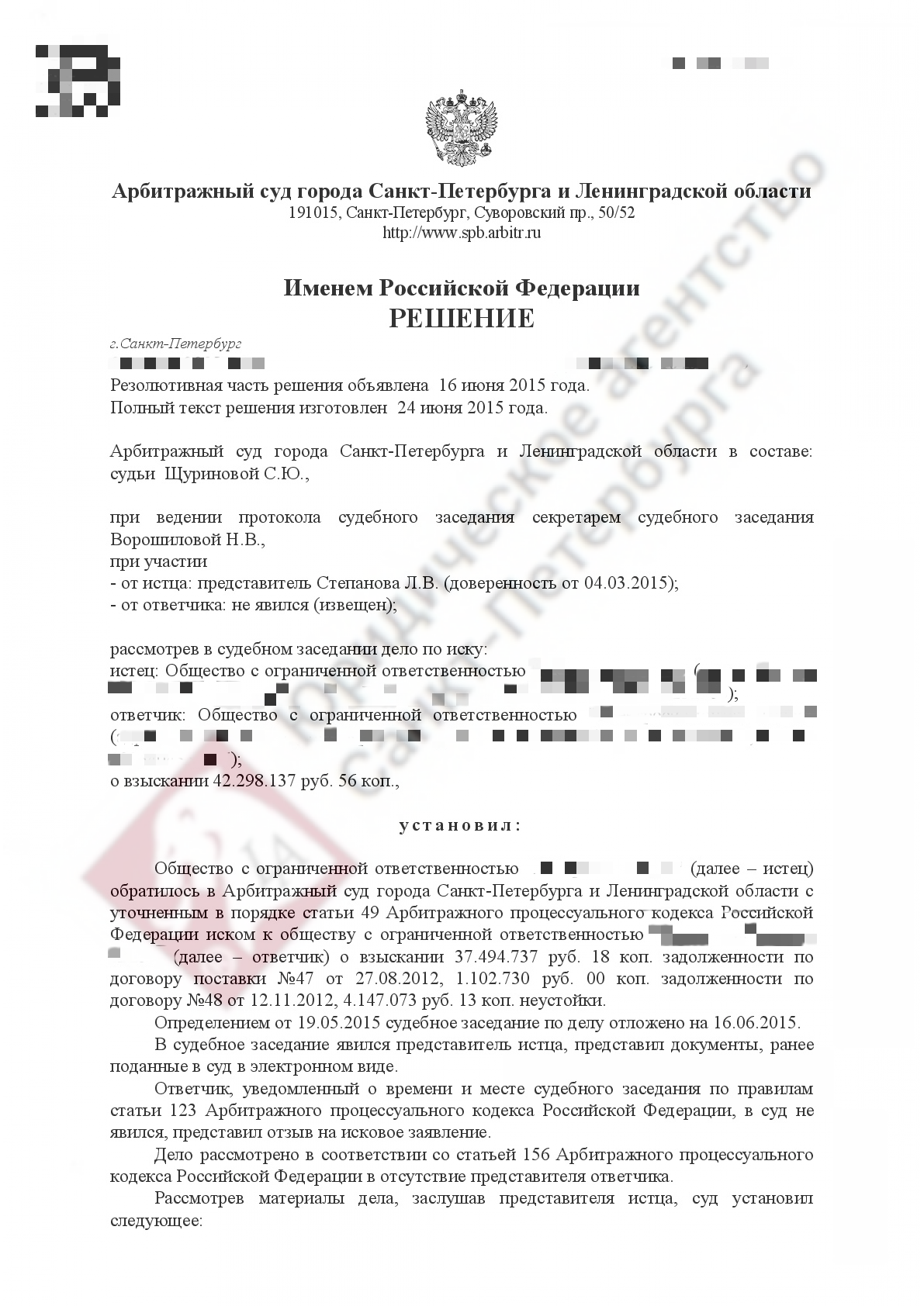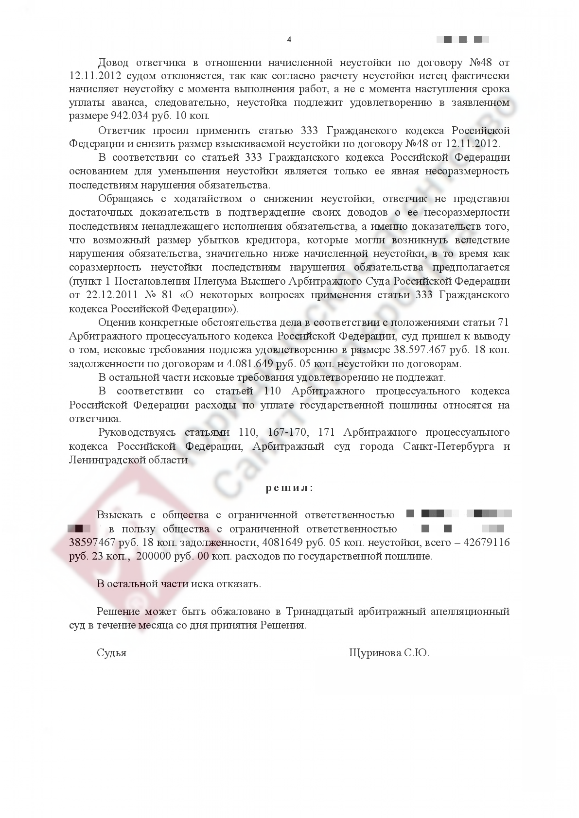РезультатБлагодаря профессиональным и оперативным действиям нашего юриста, дело было выиграно. Клиент получил 38,5 млн рублей задолженности и 4,08 млн рублей неустойки. Помимо этого, ответчик возместил ему оплату государственной пошлины — еще 200 000 рублей.