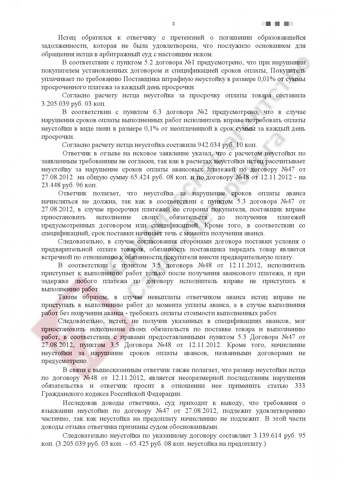 В заключенных договорах были предусмотрены штрафные санкции за нарушения сроков оплаты: 0,01% в день по договору поставки и 0,1% в день по договору оказания услуг. Итоговые размеры пеней составили 3 205 039 рублей 3 копейки и 942 034 рубля 13 копеек соответственно. Но ответчик был категорически не согласен с такими цифрами. По его словам, часть неустойки была начислена на задолженность по авансовому платежу, что не предусмотрено договором. Помимо этого, наш клиент был вправе не поставлять товар и не начинать работы до момента поступления денег на расчетный счет. Ситуация с поставкой и правда была спорной: казалось бы, зачем отгружать товар, если вторая сторона не выполнила свои обязательства по оплате? Но здесь свою роль сыграла специфичность продукции: кабель изготавливался под заказ, и его нельзя было продать другому клиенту или оставить на заводе. Выгоднее было рискнуть и отгрузить товар, чем выплачивать неустойку производителю или хранить материалы у себя на складе.Пользуешься чужими деньгами? Плати!