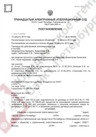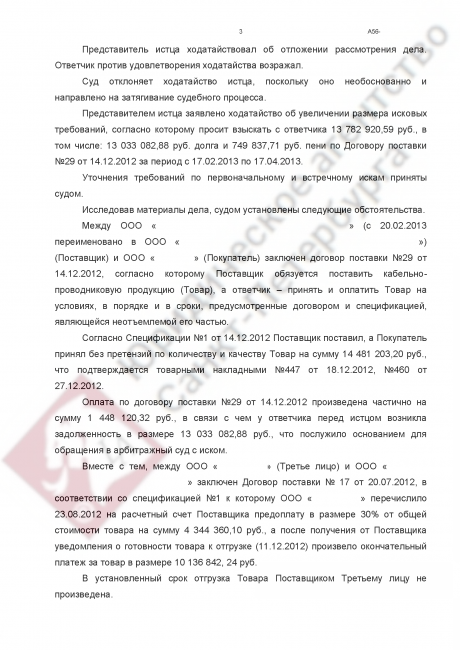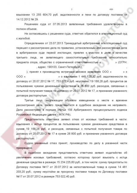 Между Клиентом (поставщик) и покупателем был заключен договор о поставке щебня. Покупатель оплатил стоимость товара, срок поставки сторонами в договоре согласован не был. Клиент направил уведомление покупателю о сроке, в которые может быть осуществлена поставка товара такого количества и качества. Покупатель за день до даты поставки, указанной в уведомлении, в устном порядке (по телефону) отказался от поставки. Клиент денежные средства покупателю вернул. Затем через некоторое время покупатель выходит в суд и требует оплатить убытки в размере 941 000 руб. за просрочку поставки товара и отказ от исполнения договора в одностороннем порядке. Дело рассматривалось в Арбитражном суде Санкт-Петербурга и Ленинградской области. Юристы нашей компании провели следующую работу:- подготовили отзывы в суд и доказательства надлежащего исполнения Клиентом своих обязательств,