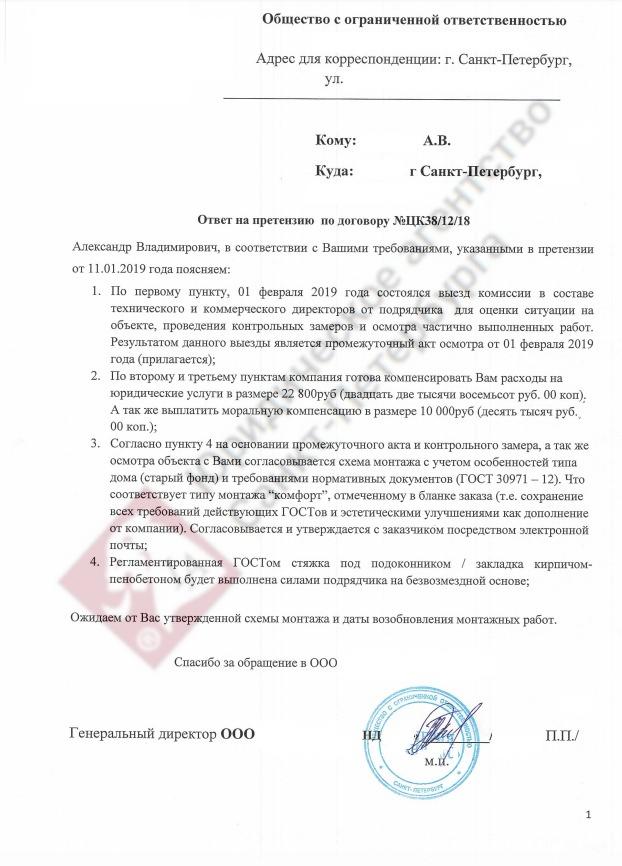 От лица клиента, ведущий юрист Каваляускас В.А. подготовил юридически грамотную претензию, в которой выставил следующие требования к компании:- Повторно выполнить работы, предусмотренные договором подряда, а именно: осуществить новый замер, изготовить и осуществить монтаж окон необходимо размера.
