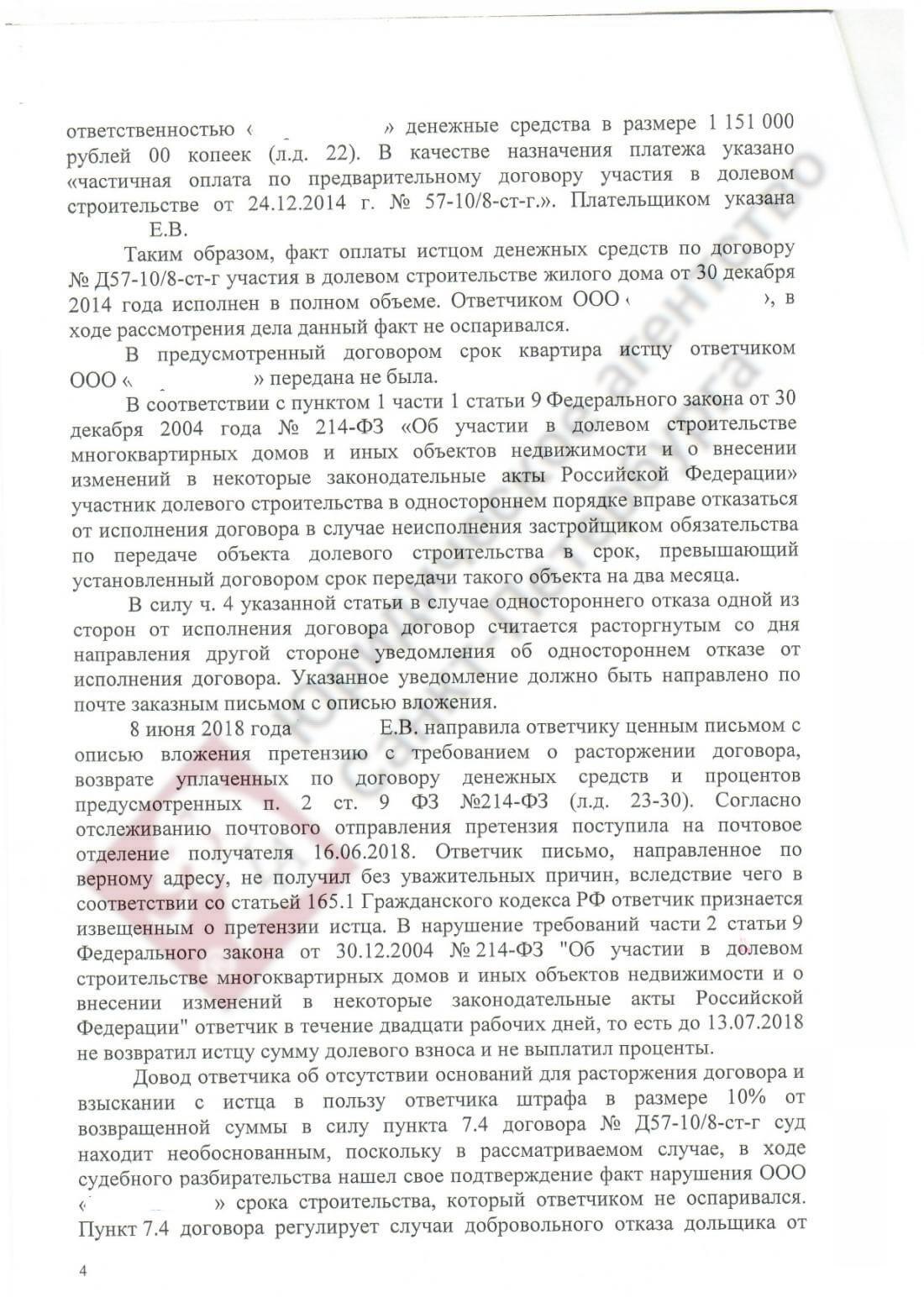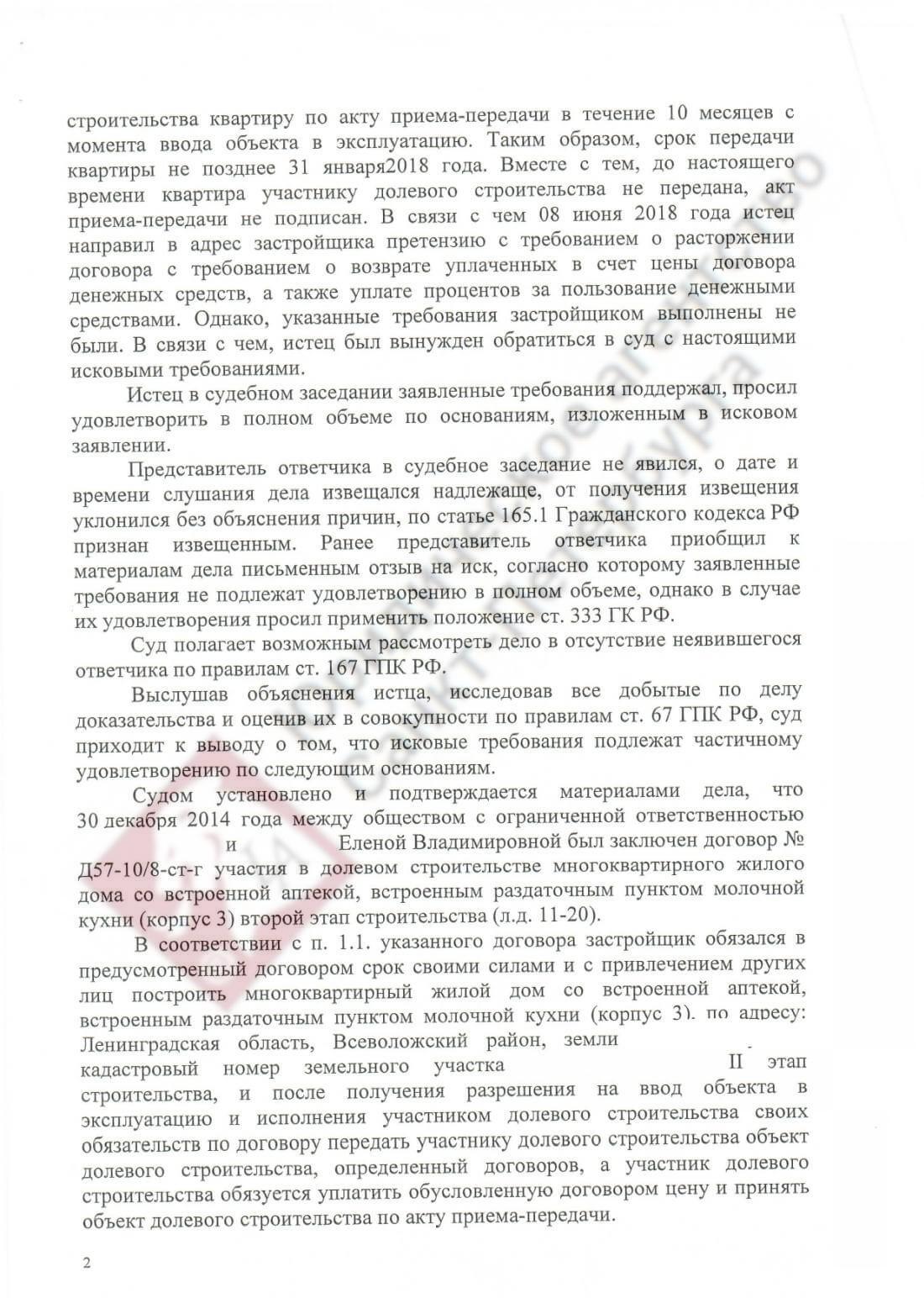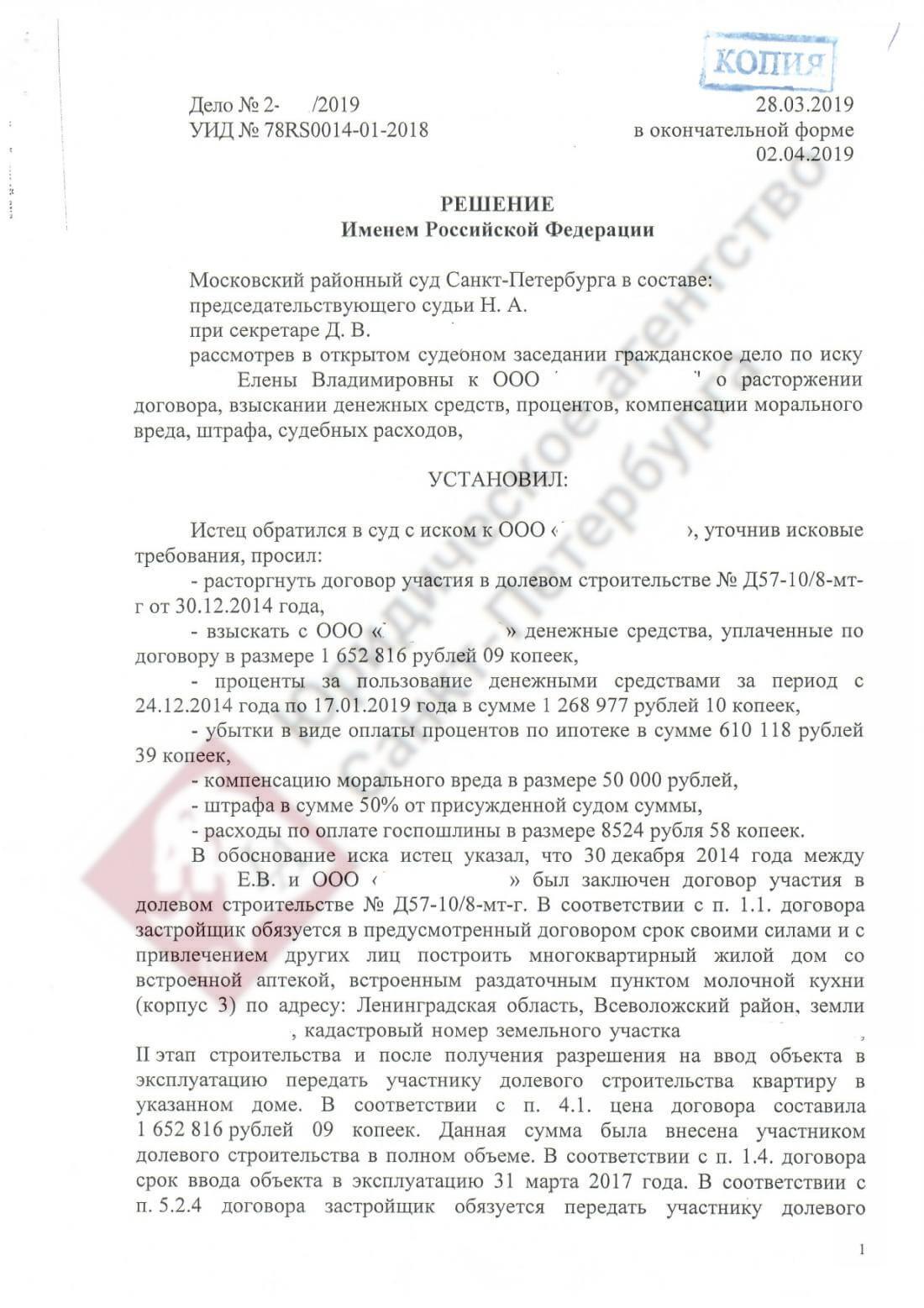 Наша юридическая команда специалистов по спорам по вопросам недвижимости подготовила претензионный пакет документов, а затем исковое заявление в суд, по которому получили положительный исход и максимальные суммы штрафов и неустоек.