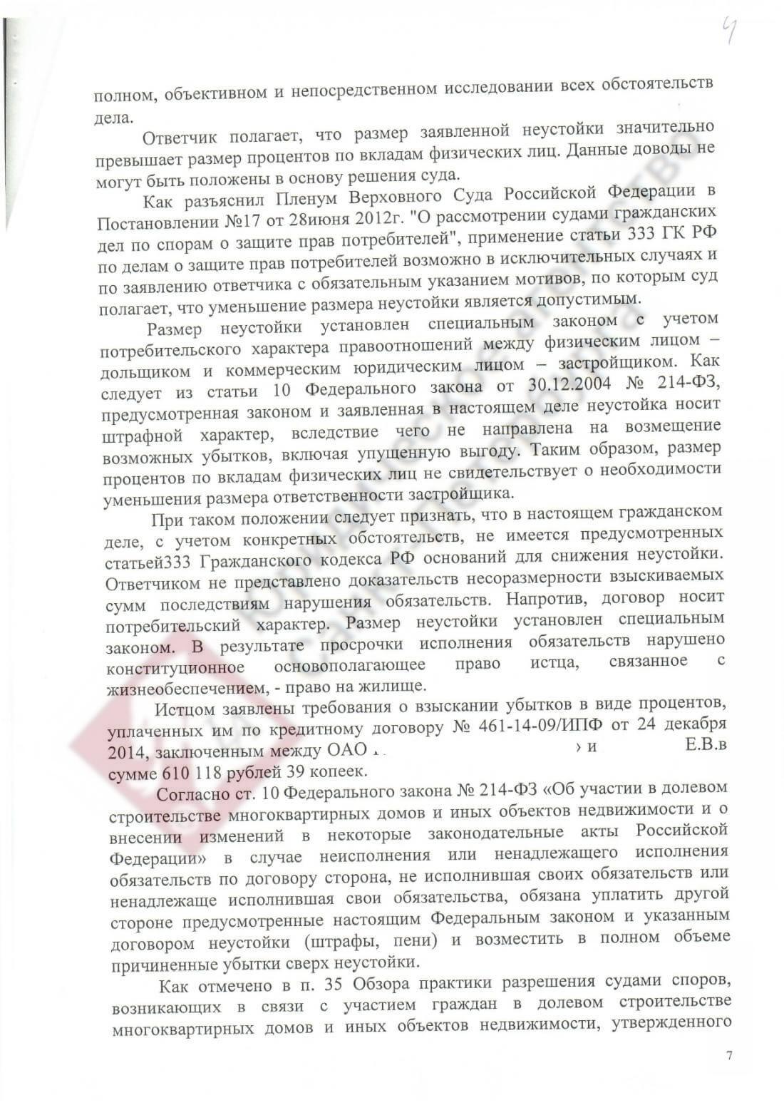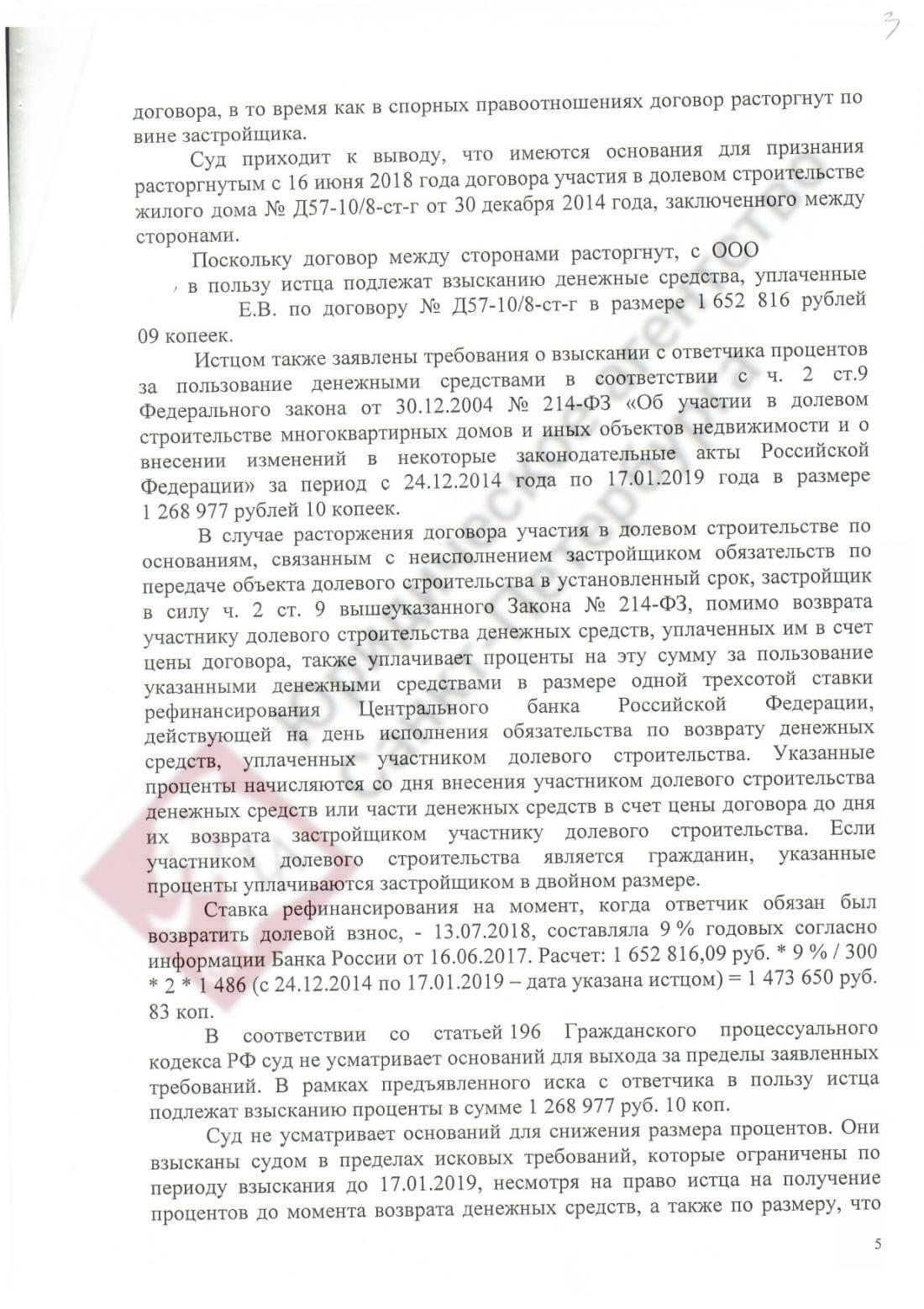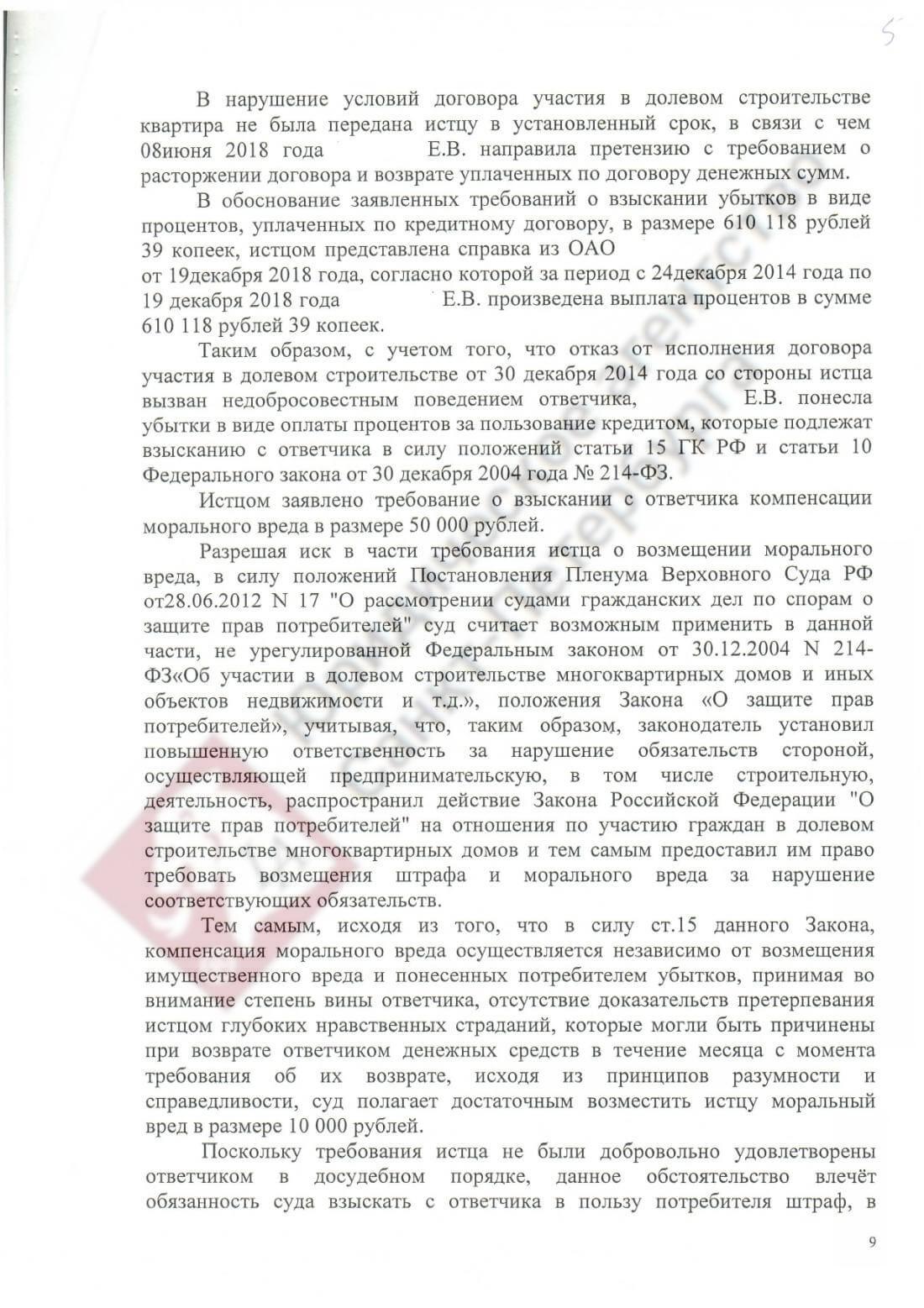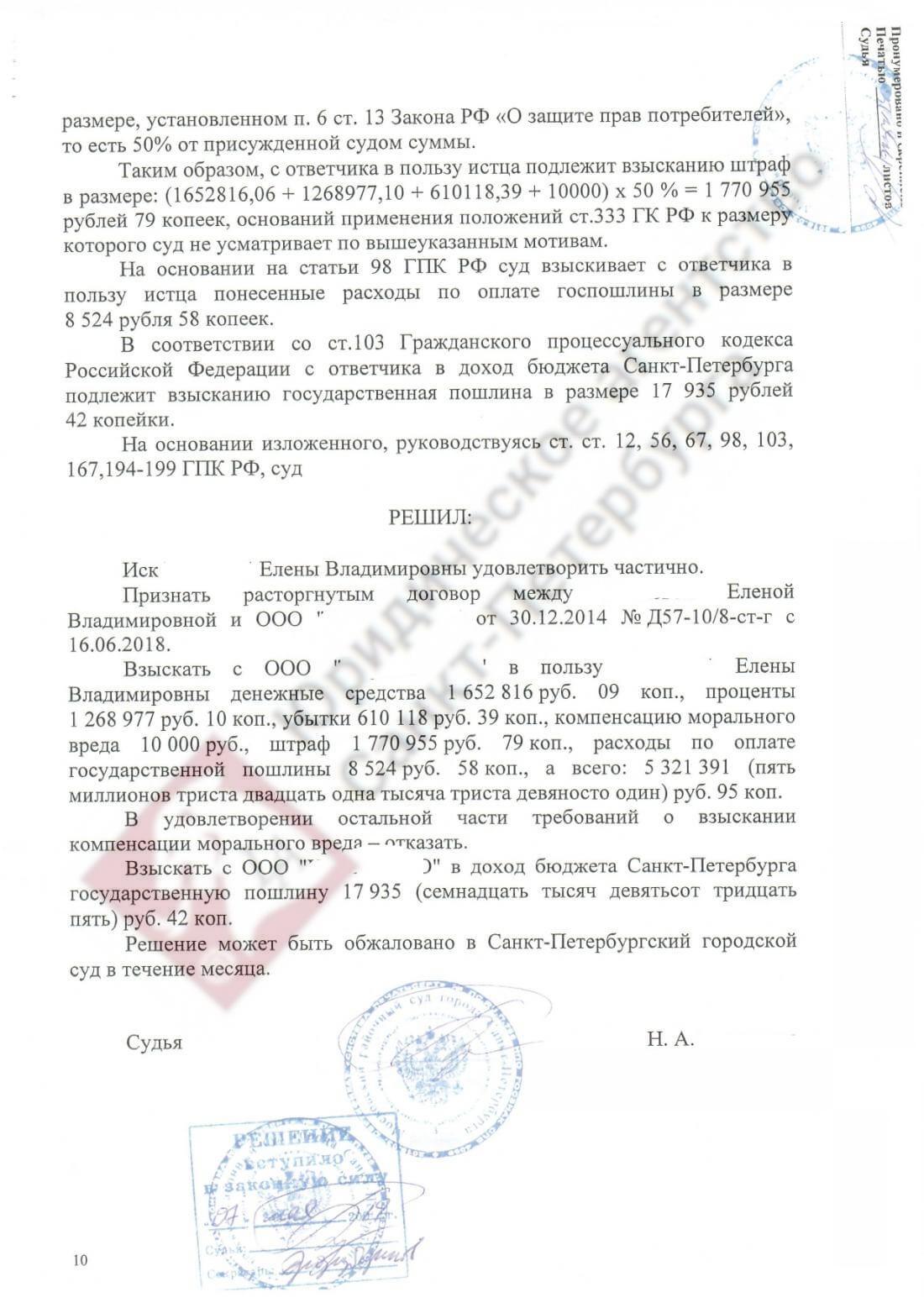 Взыскано в пользу нашего доверителя 5 321 391, 95 рублей, в том числе 1 652 816,09 - возврат денежных средств за квартиру, 1 268 977,10 - неустойка за пользование денежными средствами, 610 118, 39 – убытки, проценты по кредиту, 10 000 моральный вред, 1 770 955, 79 штраф. Государственная пошлина в размере 17 935,42 рубля взыскана с застройщика.