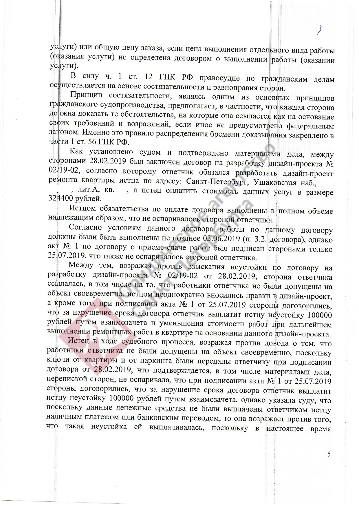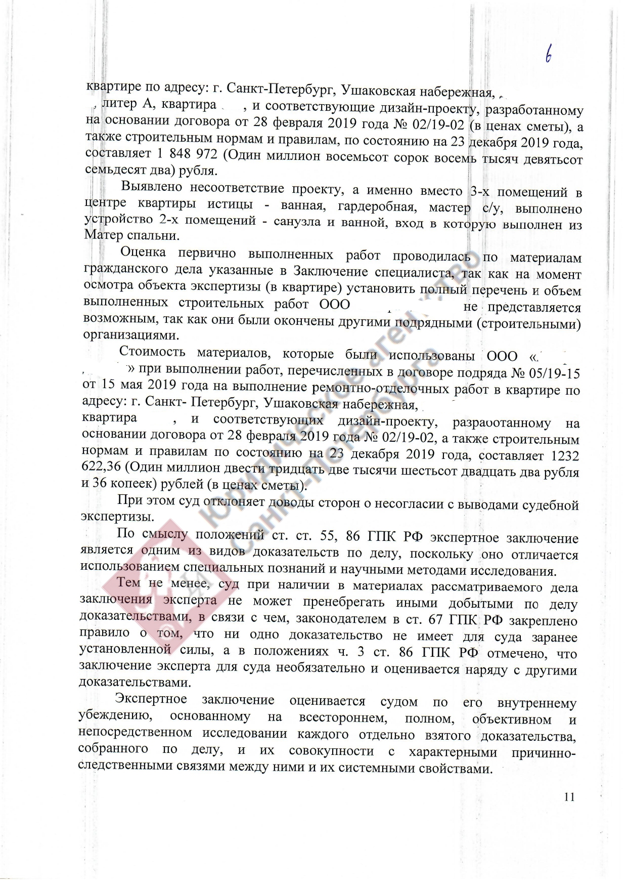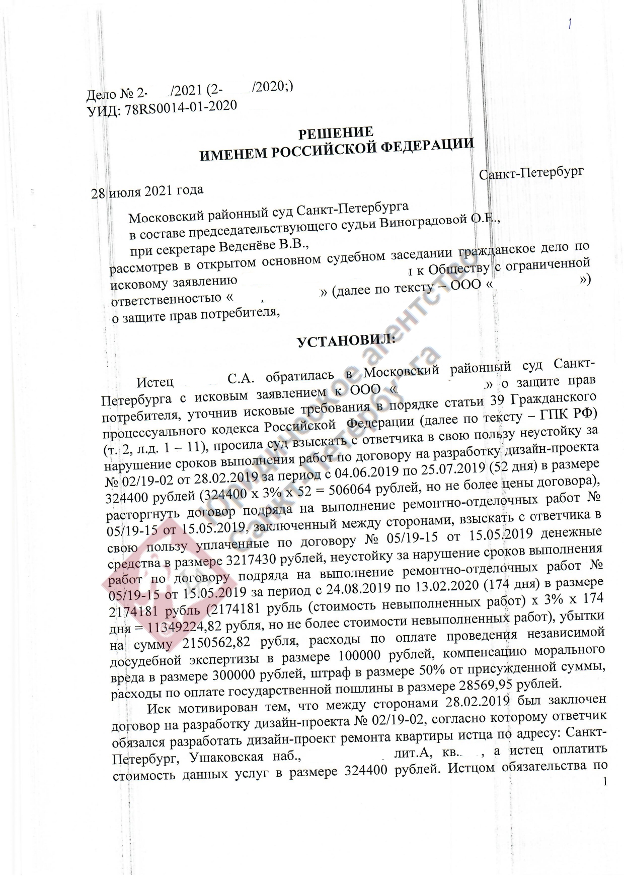 В нашу компанию поступило телефонное обращение из Бельгии. Клиент приобрела квартиру в дорогом жилищном комплексе в Санкт-Петербурге и привлекла подрядную организацию разработать дизайн проект этой квартиры и в соответствии с ним выполнить ремонтные работы. В ходе проведения ремонта выяснилось, что в дизайн проекте имеется множество нарушений, которые повлекли за собой нарушения в реализации всего проекта и как следствие массу строительных ошибок.Клиент не захотела, чтобы данная подрядная организация продолжала выполнять работы изакрыла доступ строителям на объект и обратилась к нам. За строительные работы Клиент заплатила 3 217 430 рублей. И приобрела строительные материалы на сумму 932 313 рублей, которые были использованы в ремонте.Решение