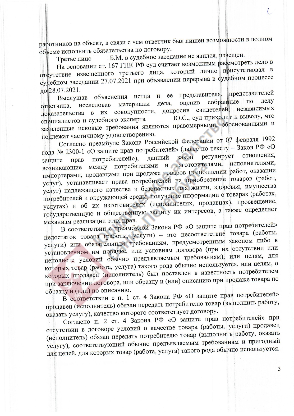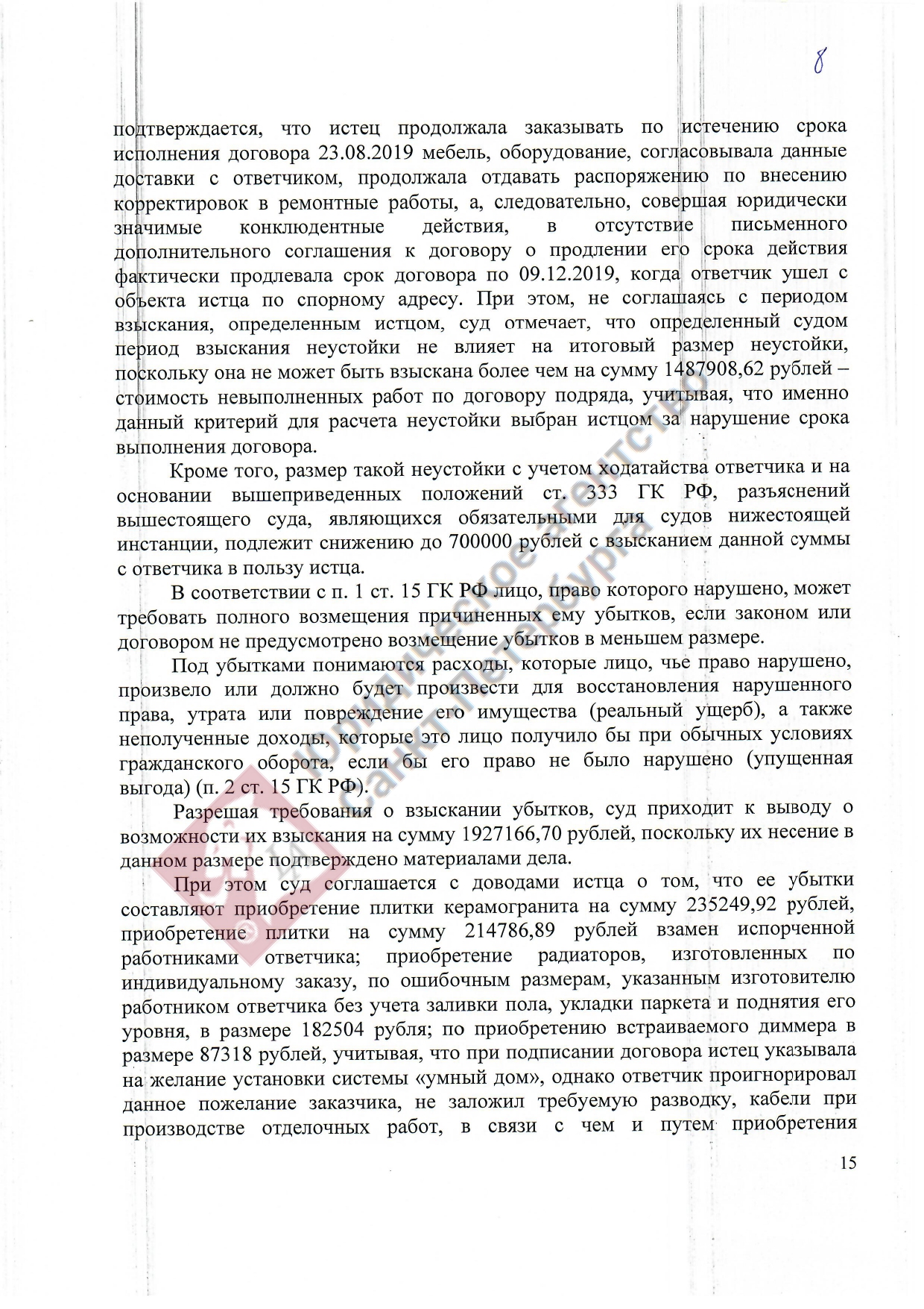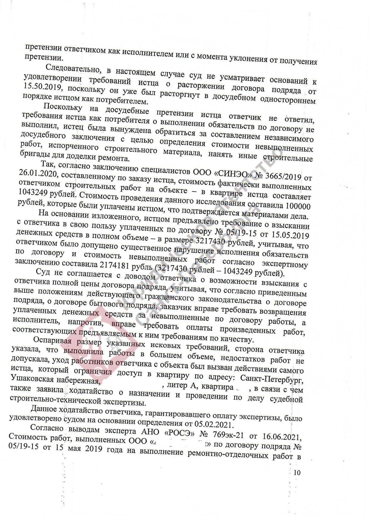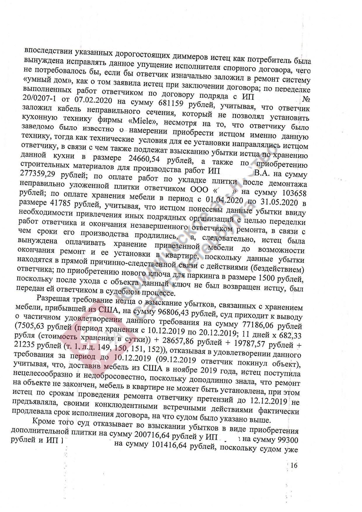 В нашу компанию поступило телефонное обращение из Бельгии. Клиент приобрела квартиру в дорогом жилищном комплексе в Санкт-Петербурге и привлекла подрядную организацию разработать дизайн проект этой квартиры и в соответствии с ним выполнить ремонтные работы. В ходе проведения ремонта выяснилось, что в дизайн проекте имеется множество нарушений, которые повлекли за собой нарушения в реализации всего проекта и как следствие массу строительных ошибок.Клиент не захотела, чтобы данная подрядная организация продолжала выполнять работы изакрыла доступ строителям на объект и обратилась к нам. За строительные работы Клиент заплатила 3 217 430 рублей. И приобрела строительные материалы на сумму 932 313 рублей, которые были использованы в ремонте.Решение