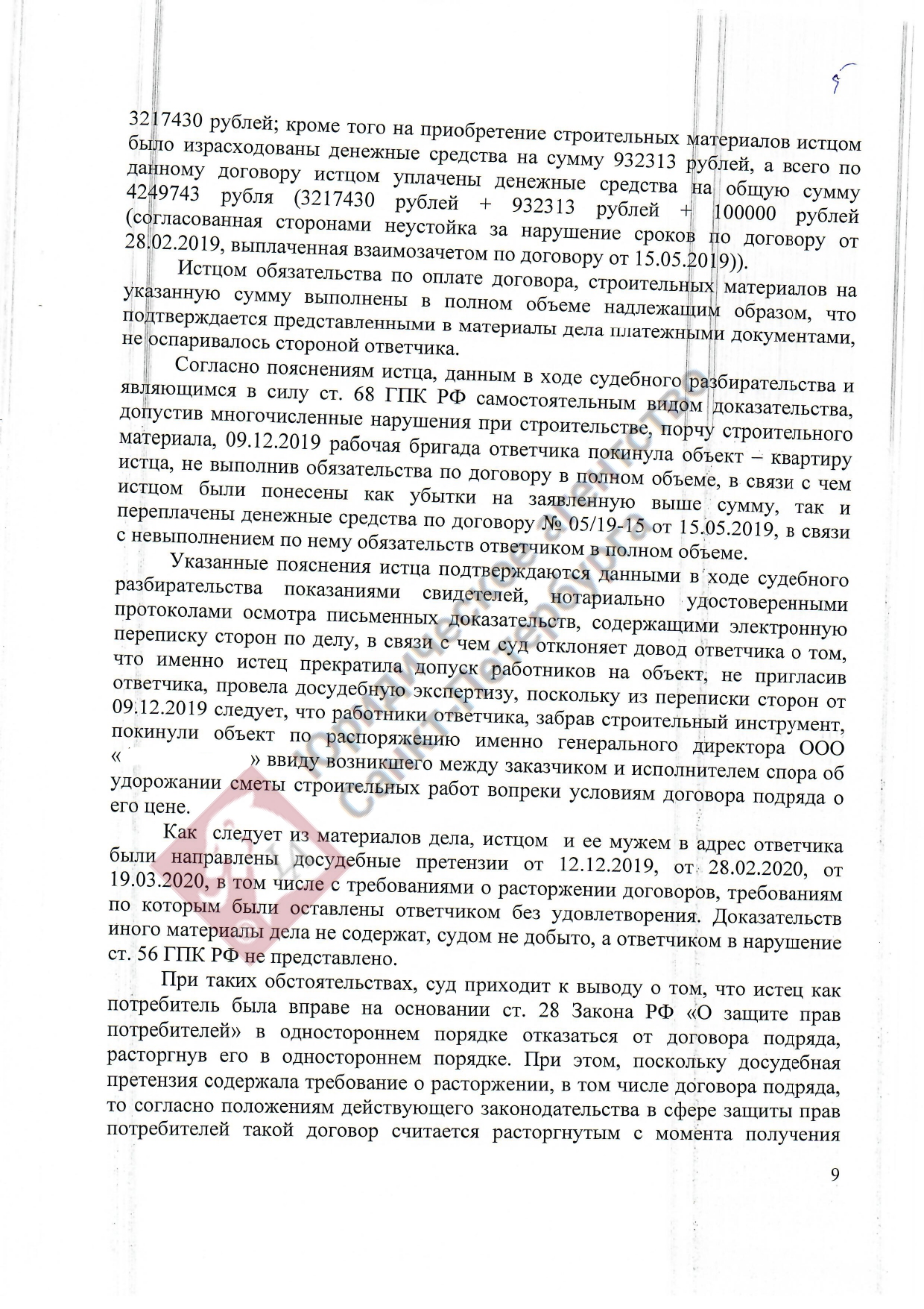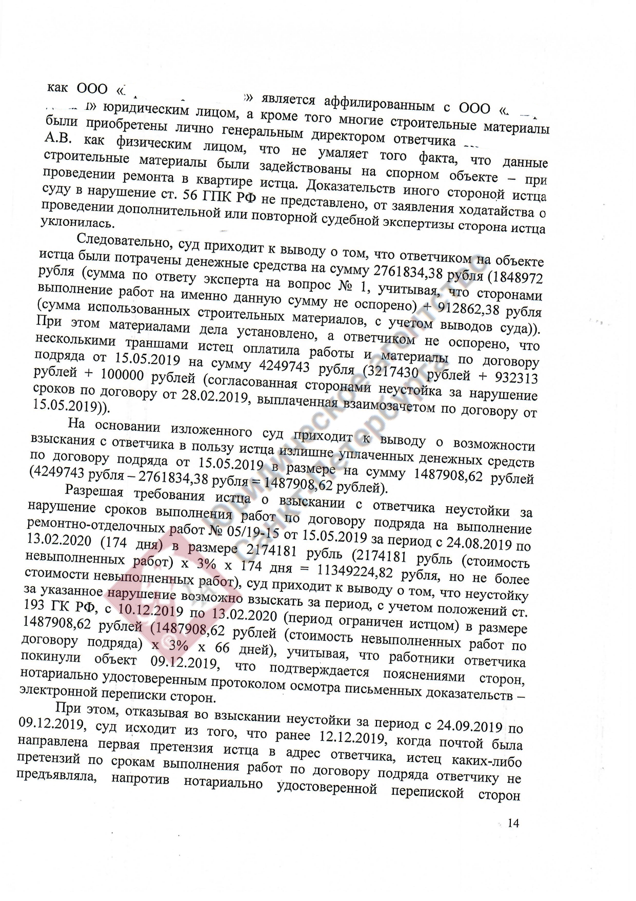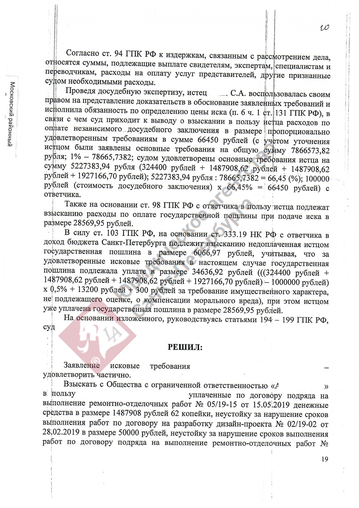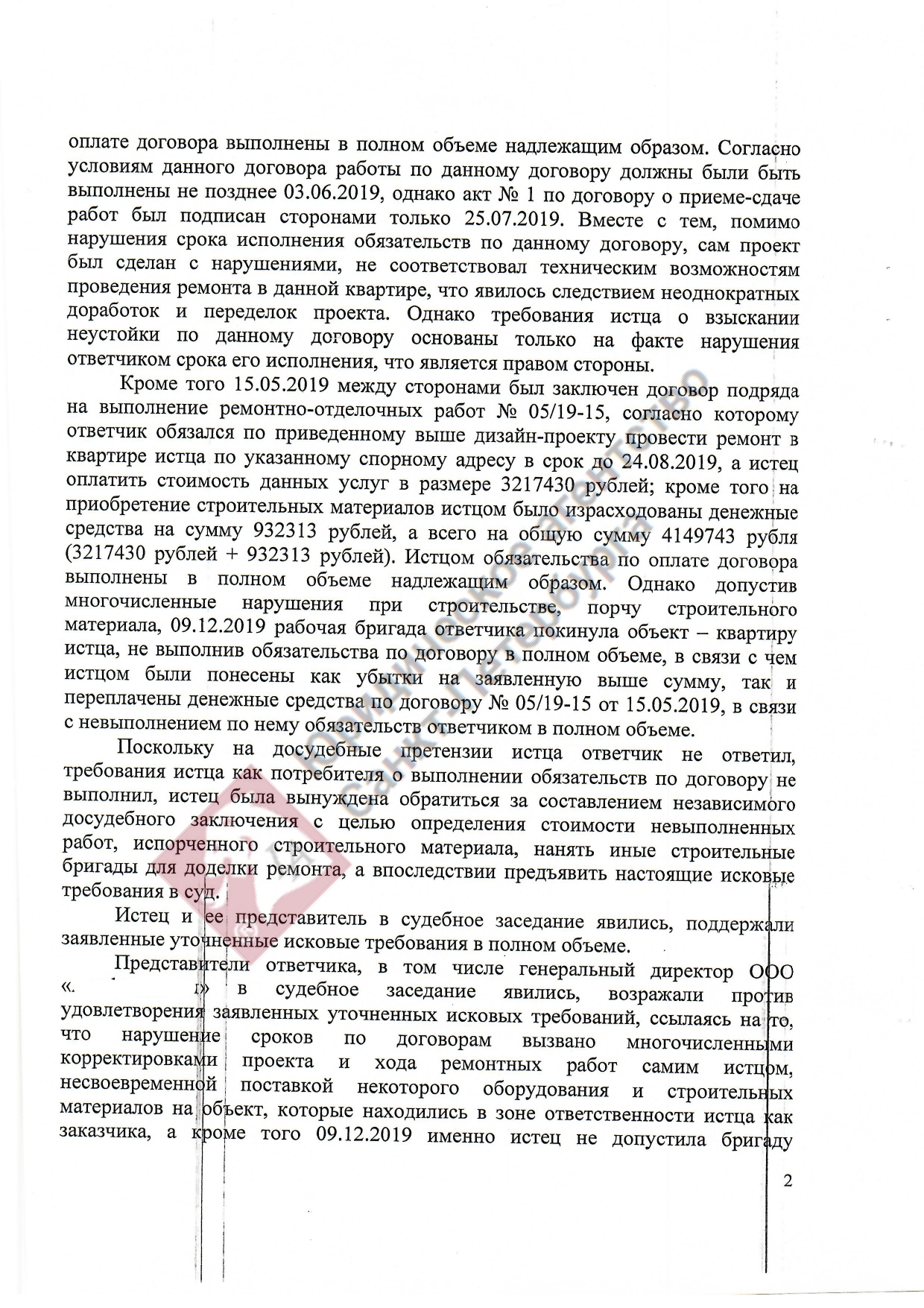 В досудебном порядке подрядная организация отказаласьурегулировать спор. С нашей стороны была проведена досудебная экспертиза в экспертном учреждении, которая подтвердила некачественное выполнение работ, установила отсутствие технический и исполнительной документации на проект. Далее Клиент с помощью привлечения иных строительных бригад завершила ремонт в квартире, и мы предъявили финансовые требования к первой строительной компании. В требования включили: возврат стоимости некачественно выполненных работ, неустойку, убытки (оплата работы строительных бригад, которые переделывали работу первоначального подрядчика; покупка новых строительных материалов; возмещение убытков по не правильно подобранным радиаторам; частичное возмещение расходов по испорченным материалам), расходы по проведению экспертизы и на юридические услуги. В суде Ответчик провел судебную экспертизу, с которой мы не согласились и провели рецензию на нее. Так же с нашей стороны были допрошены свидетели, которые подтвердили всю нашу позицию, а так же предоставлено документальное подтверждение по каждому затраченному рублю на устранение недостатков после недобросовестной строительной компании. Одной из сложностей процесса являлся тот факт, что ремонт в квартире на момент проведения судебной экспертизы был полностью окончен и эксперт проводил экспертизу по документам с выездом на объект. Так же нам удалось разграничить, что было выполнено ответчиком, какие материалы и в каком объеме были испорчены, какие расходы были затрачены на новые материалы и оплату работы новых строительных бригад. Это трудоемкий процесс занял более года времени нашего специалиста, но принес замечательную победу.РезультатСуд присудил в пользу Клиента 5 096 159 рублей, а именно: 1 487 908 рублей – возврат денежных средств, уплаченных по договору, 750 000 рублей – неустойка за нарушение сроков, 30 000 рублей – компенсация морального вреда, 800 000 рублей – штраф за неисполнение обязательств в добровольном порядке, 66 450 рублей – компенсация стоимости экспертизы, 1 927 166 рублей – убытки за испорченные материалы и на приобретение новых материалов, 34 635 рублей – судебные расходы.