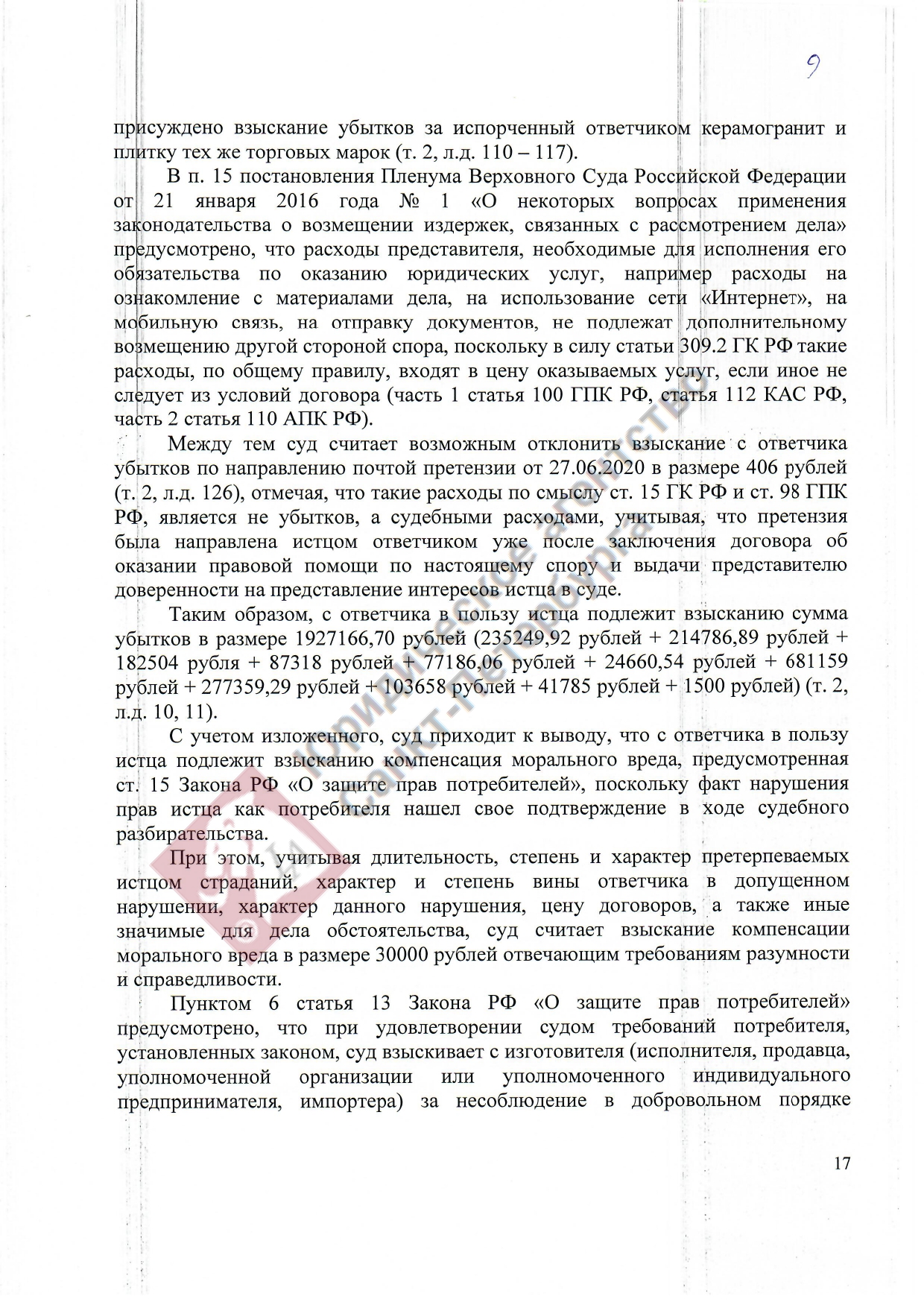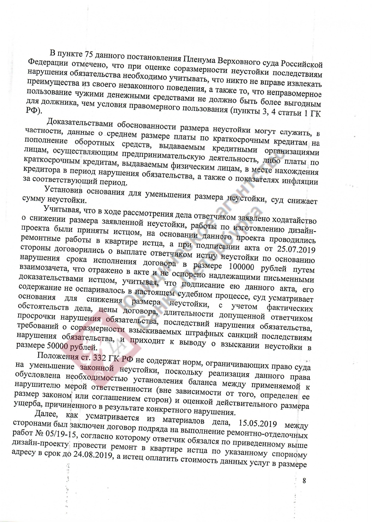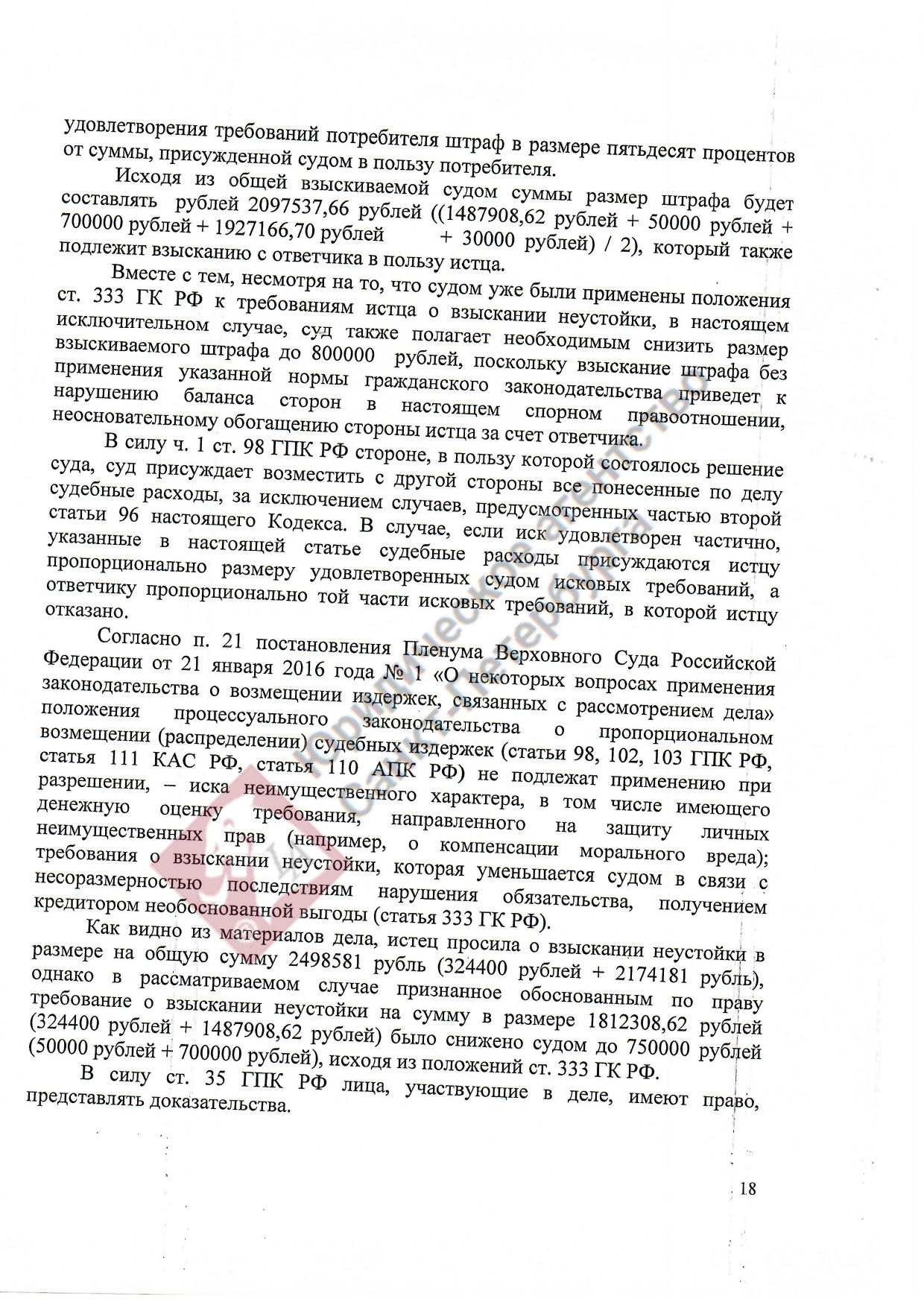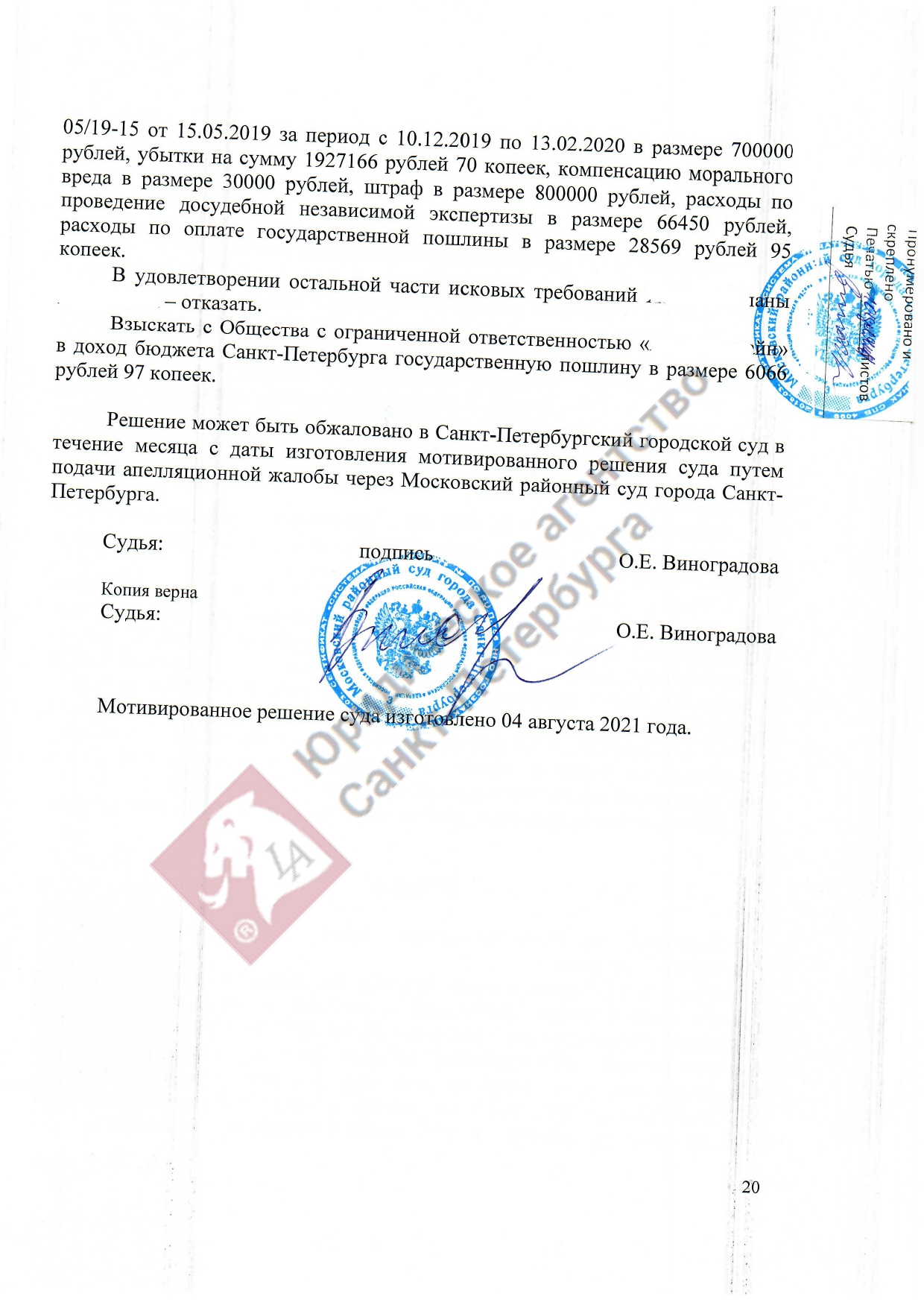 В досудебном порядке подрядная организация отказаласьурегулировать спор. С нашей стороны была проведена досудебная экспертиза в экспертном учреждении, которая подтвердила некачественное выполнение работ, установила отсутствие технический и исполнительной документации на проект. Далее Клиент с помощью привлечения иных строительных бригад завершила ремонт в квартире, и мы предъявили финансовые требования к первой строительной компании. В требования включили: возврат стоимости некачественно выполненных работ, неустойку, убытки (оплата работы строительных бригад, которые переделывали работу первоначального подрядчика; покупка новых строительных материалов; возмещение убытков по не правильно подобранным радиаторам; частичное возмещение расходов по испорченным материалам), расходы по проведению экспертизы и на юридические услуги. В суде Ответчик провел судебную экспертизу, с которой мы не согласились и провели рецензию на нее. Так же с нашей стороны были допрошены свидетели, которые подтвердили всю нашу позицию, а так же предоставлено документальное подтверждение по каждому затраченному рублю на устранение недостатков после недобросовестной строительной компании. Одной из сложностей процесса являлся тот факт, что ремонт в квартире на момент проведения судебной экспертизы был полностью окончен и эксперт проводил экспертизу по документам с выездом на объект. Так же нам удалось разграничить, что было выполнено ответчиком, какие материалы и в каком объеме были испорчены, какие расходы были затрачены на новые материалы и оплату работы новых строительных бригад. Это трудоемкий процесс занял более года времени нашего специалиста, но принес замечательную победу.РезультатСуд присудил в пользу Клиента 5 096 159 рублей, а именно: 1 487 908 рублей – возврат денежных средств, уплаченных по договору, 750 000 рублей – неустойка за нарушение сроков, 30 000 рублей – компенсация морального вреда, 800 000 рублей – штраф за неисполнение обязательств в добровольном порядке, 66 450 рублей – компенсация стоимости экспертизы, 1 927 166 рублей – убытки за испорченные материалы и на приобретение новых материалов, 34 635 рублей – судебные расходы.