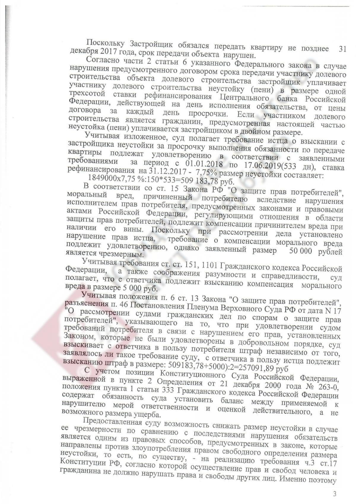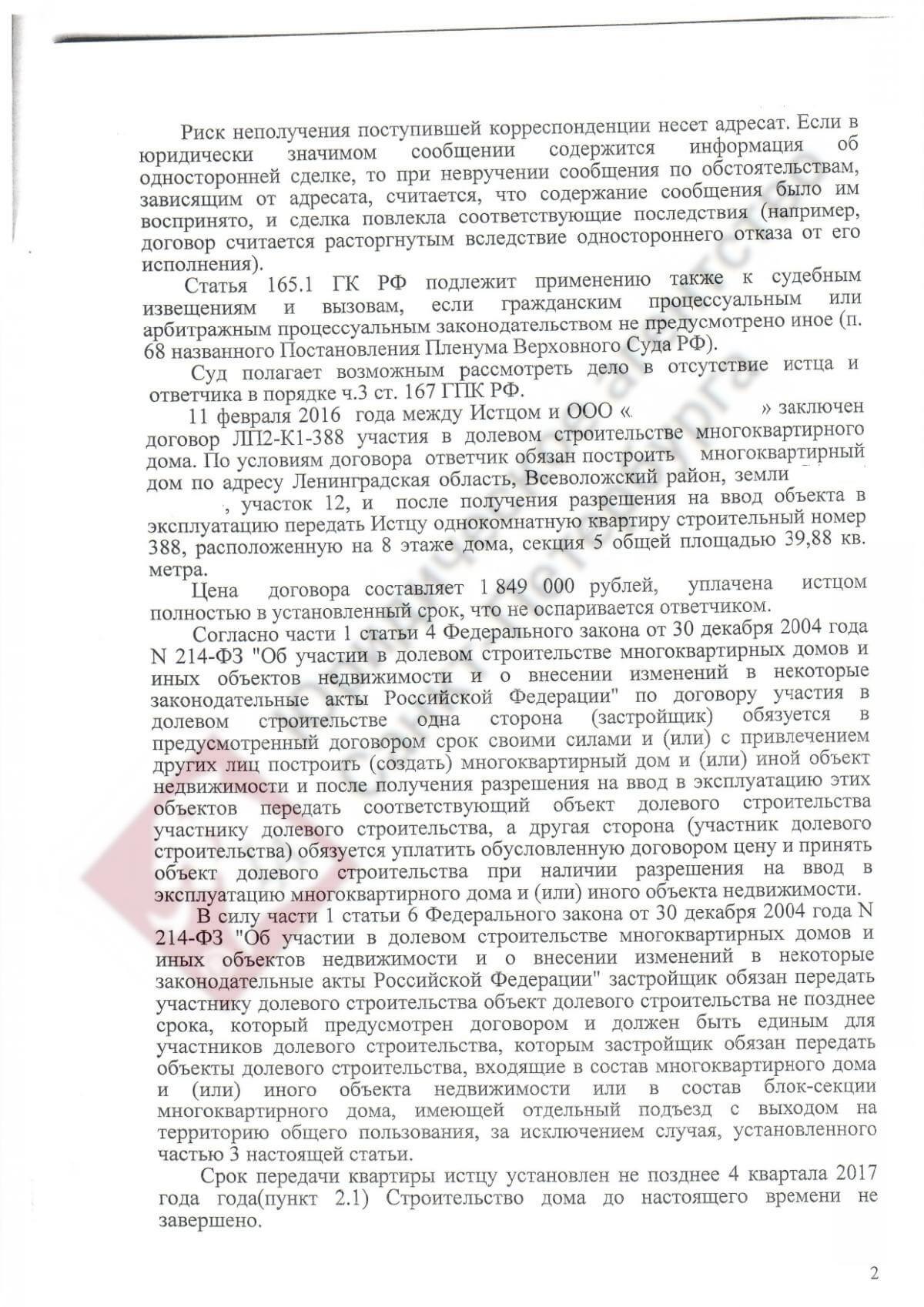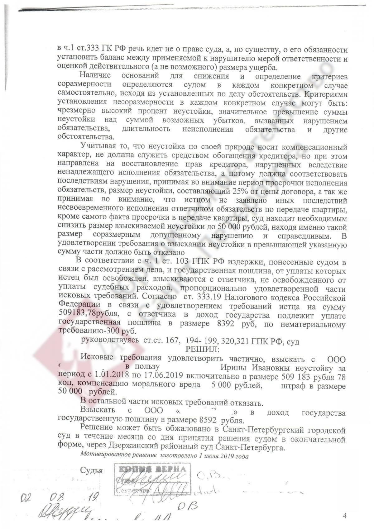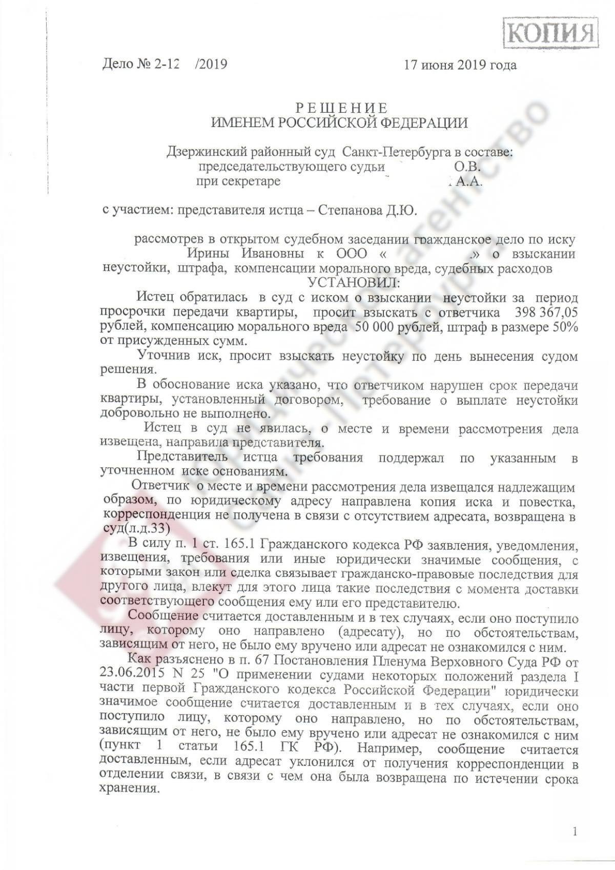 Наша юридическая команда специалистов по спорам по вопросам недвижимости подготовила претензионный пакет документов, а затем исковое заявление в суд, по которому получили положительный исход. Самой важной победой в данном споре стало, что суд не уменьшил размер неустойки по требованию застройщика. Этого можно добиться, только имея многолетний опыт решения таких споров и зная практику конкретного судьи и аспекты которые данный судья принимает к вниманию.  Учитывая, что практика  у наших специалистов данного отдела более 15 лет, они знаю абсолютно все нюансы ведения данной категории споров и практически всех судей, которые рассматривают данную категорию дел.