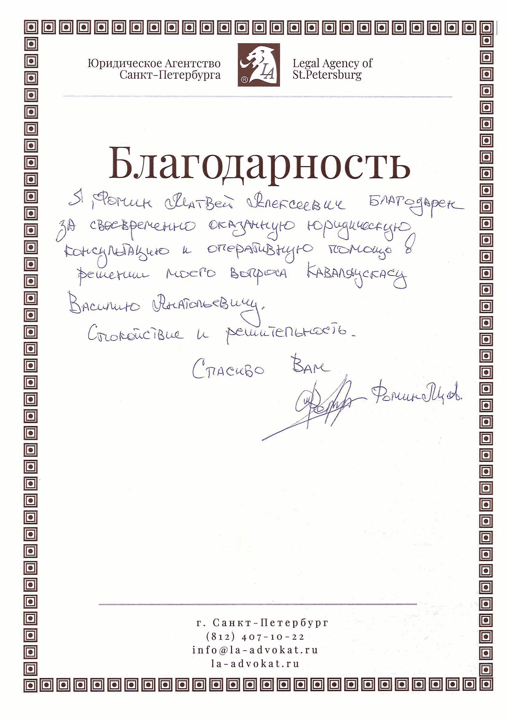 Я, Фомин Матвей Алексеевич, благодарен за своевременно оказанную юридическую консультацию и оперативную помощь в решении моего вопроса Каваляускас Василию Анатольевичу.