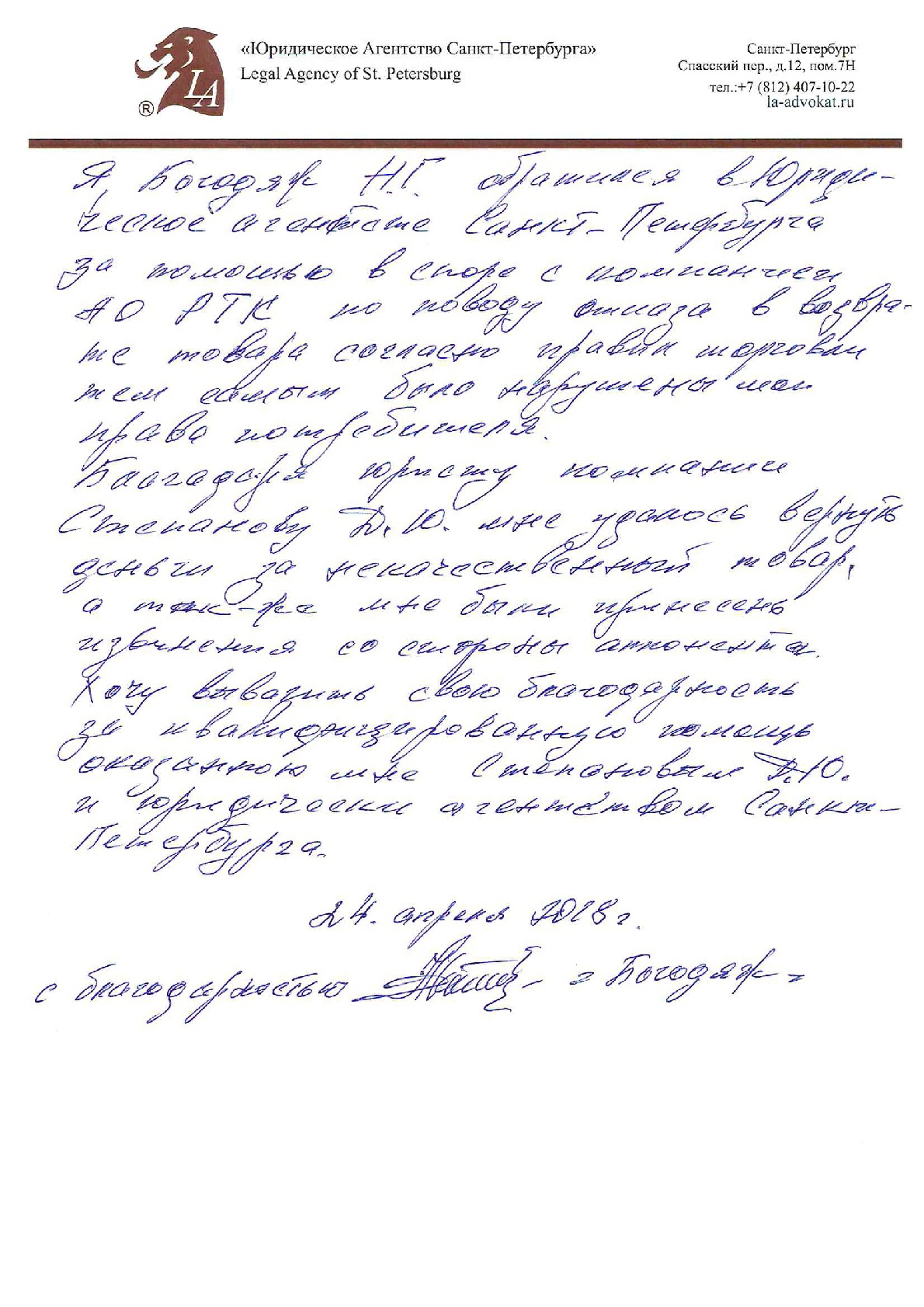 Я, Богодяж Н. Г. обратился в Юридическое агентство Санкт-Петербурга за помощью в споре с компанией АО РТК по поводу отказа в возврате товара согласно правил торговли, тем самым были нарушены мои права потребителя.