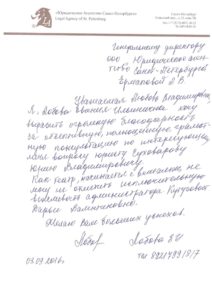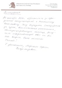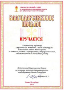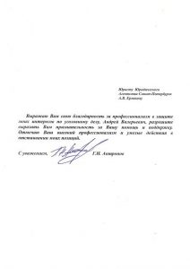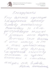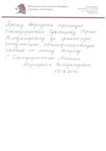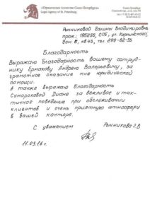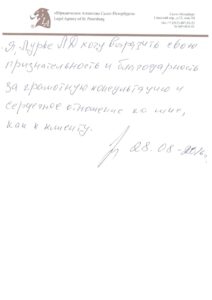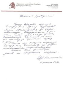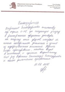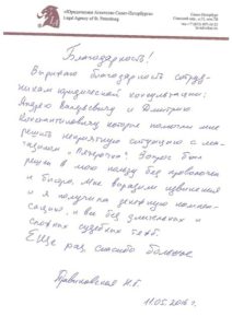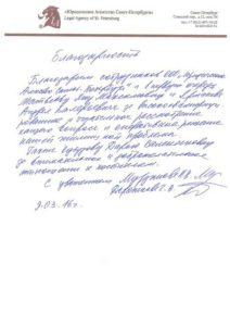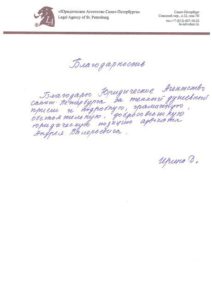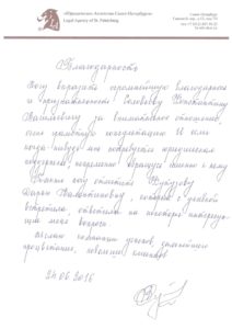 Юристам Юридического Агентства Санкт-Петербурга Выражаю Вам свою благодарность за профессионализм в защите моих интересов по уголовному делу, разрешите выразить Вам признательность за Вашу помощь и поддержку. О..