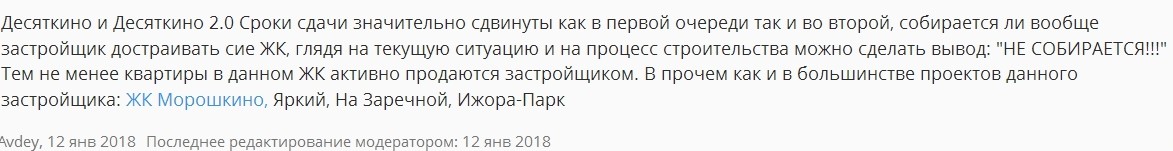 - 21 декабря 2017 года на заседании комиссии «По проблемам потенциальных обманутых дольщиков» губернатор Ленобласти Александр Дрозденко заявил, что указанные застройщиком ЖК «Десяткино 2.0» сроки сдачи объекта (лето 2018-го) чересчур оптимистичны;