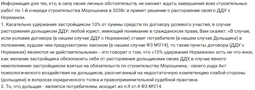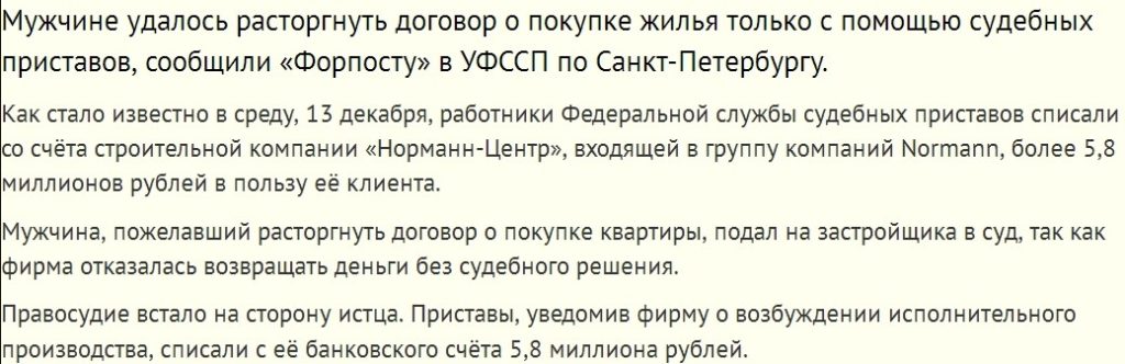 Несмотря на слухи о банкротстве застройщика, факт его ухода с рынка из-за финансовых проблем никак не подтвержден (это касается именно ООО «Норманн-ЛО», тогда как аффилированная с ним организация ООО «Норманн» близка к банкротству). А значит, дольщики не имеют права требовать ни передачи им жилья (пусть и недостроенного), ни включения в реестр кредиторов.