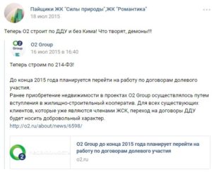 Дополнительный оптимизм внушила новость, что в середине 2015 года застройщик объявил о переводе пайщиков на договоры долевого участия в соответствии с законом № 214-ФЗ. Этот закон защищает права покупателей жилья более надежно, чем правовой акт о кооперативном строительстве, который позволяет застройщику переносить срок ввода дома в эксплуатацию любое количество раз. Покупатели первой очереди остались пайщиками, а во второй все перешли на ДДУ, заключив договоры с дочерней компанией застройщика — ООО «Романтика». С этого момента застройщиками жилого комплекса стали две разные компании: у первой очереди — ЖСК «Мурино-1», у второй — ООО «Романтика». При этом O2 Development входил в состав правления первой организации и являлся учредителем второй.